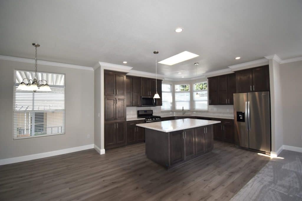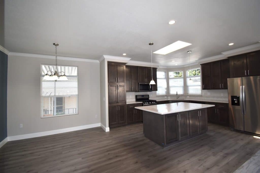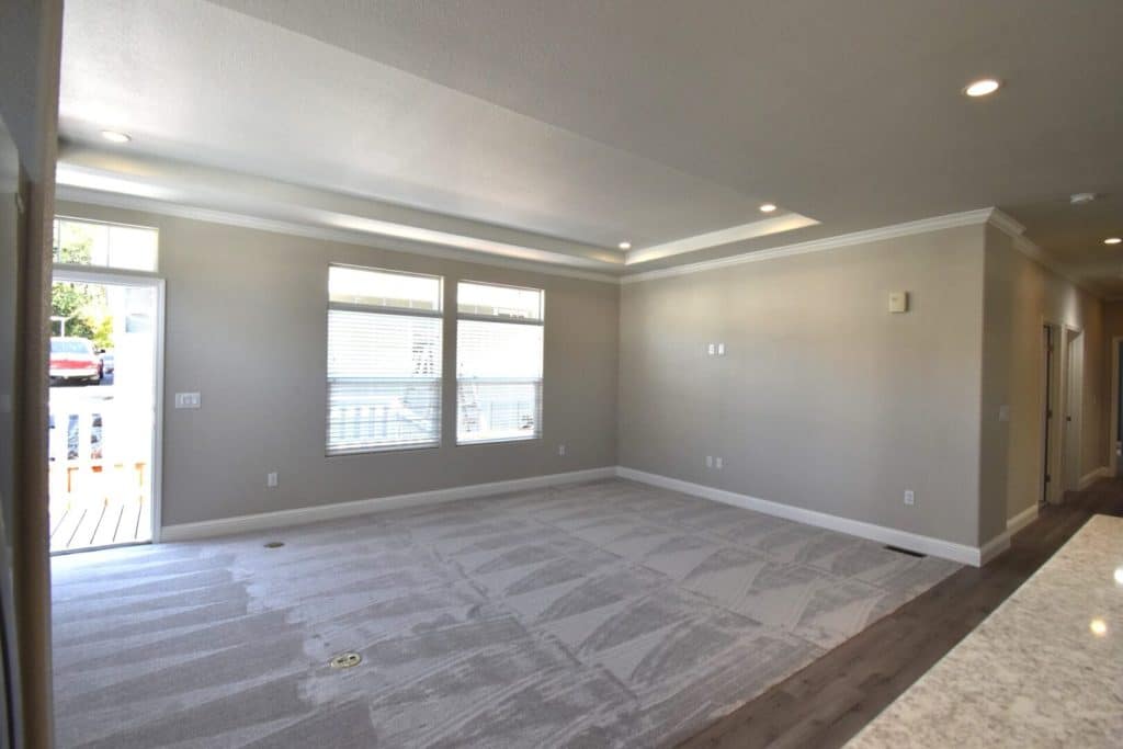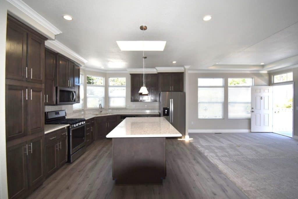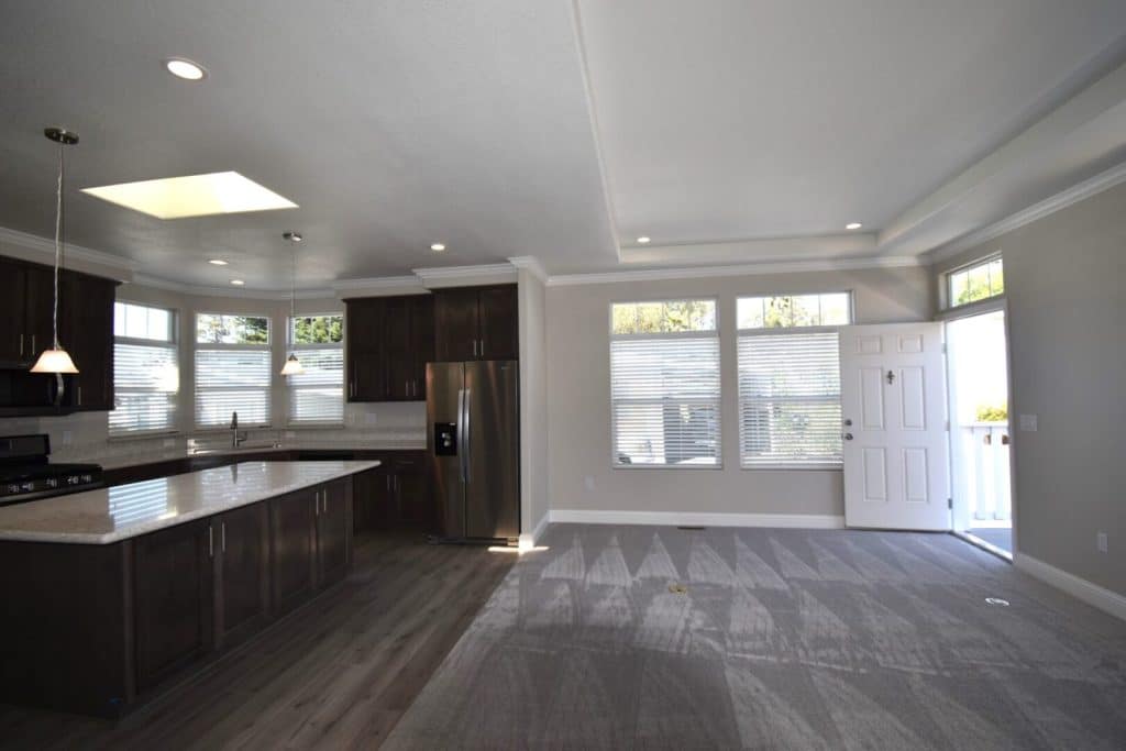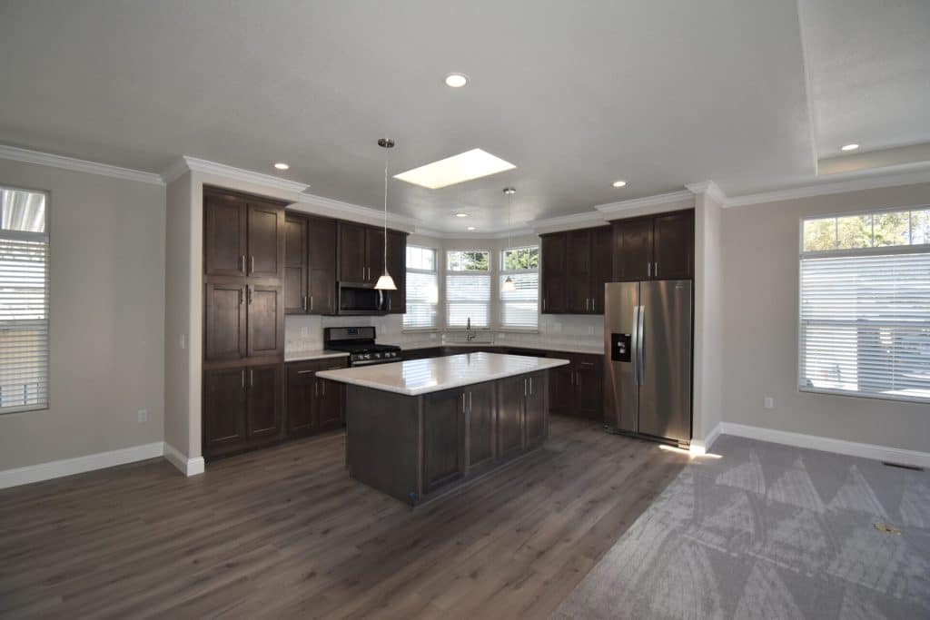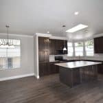 The 1533SF spacious open floor plan has large rooms, 3 bedrooms, beautiful luxury bathrooms, wide hallway and doorways, 9’ ceilings with crown moldings, beautiful high-quality laminate floors and upgraded carpet. The fabulous kitchen has beautiful quartz counters, large island that sits 4, stainless steel appliances and lots of gorgeous cabinets space. The primary bathroom has a gorgeous custom walk-in tile shower, quartz counters and lots of storage. Large windows, skylights and solar tubes flood the house with light. It also has the best utility room of any manufactured home you will find with washer and dryer, tons of extra storage, a coat closet and full pantry.