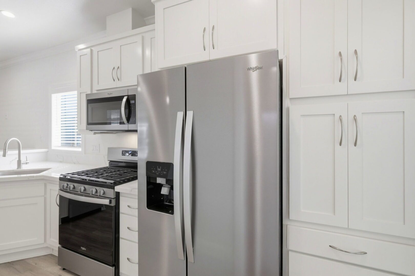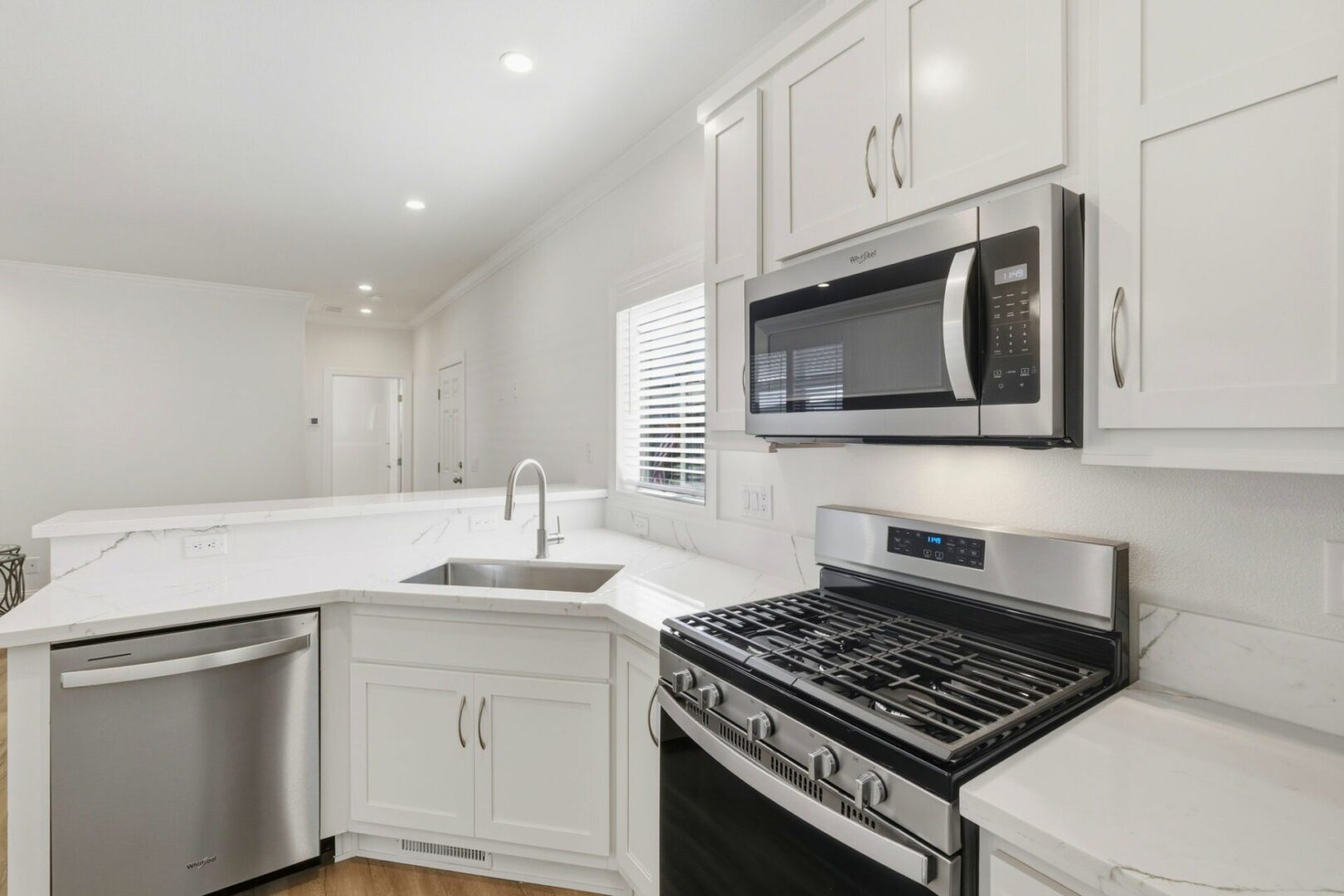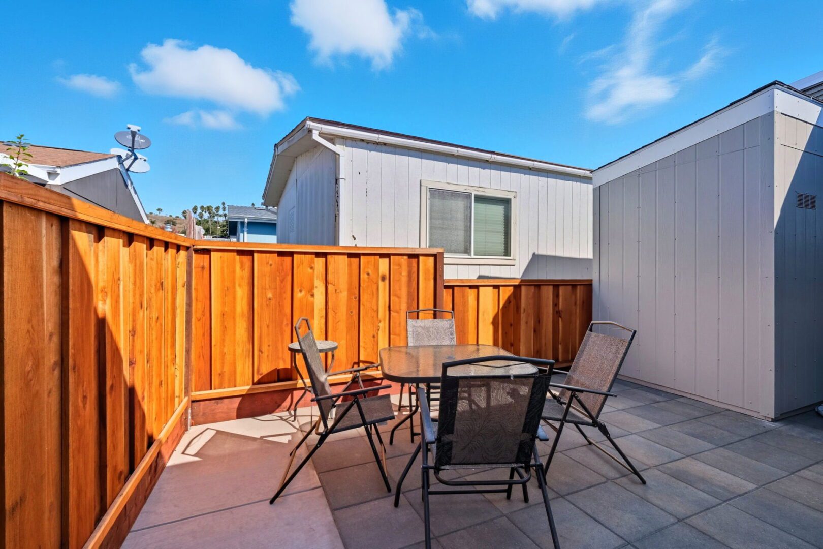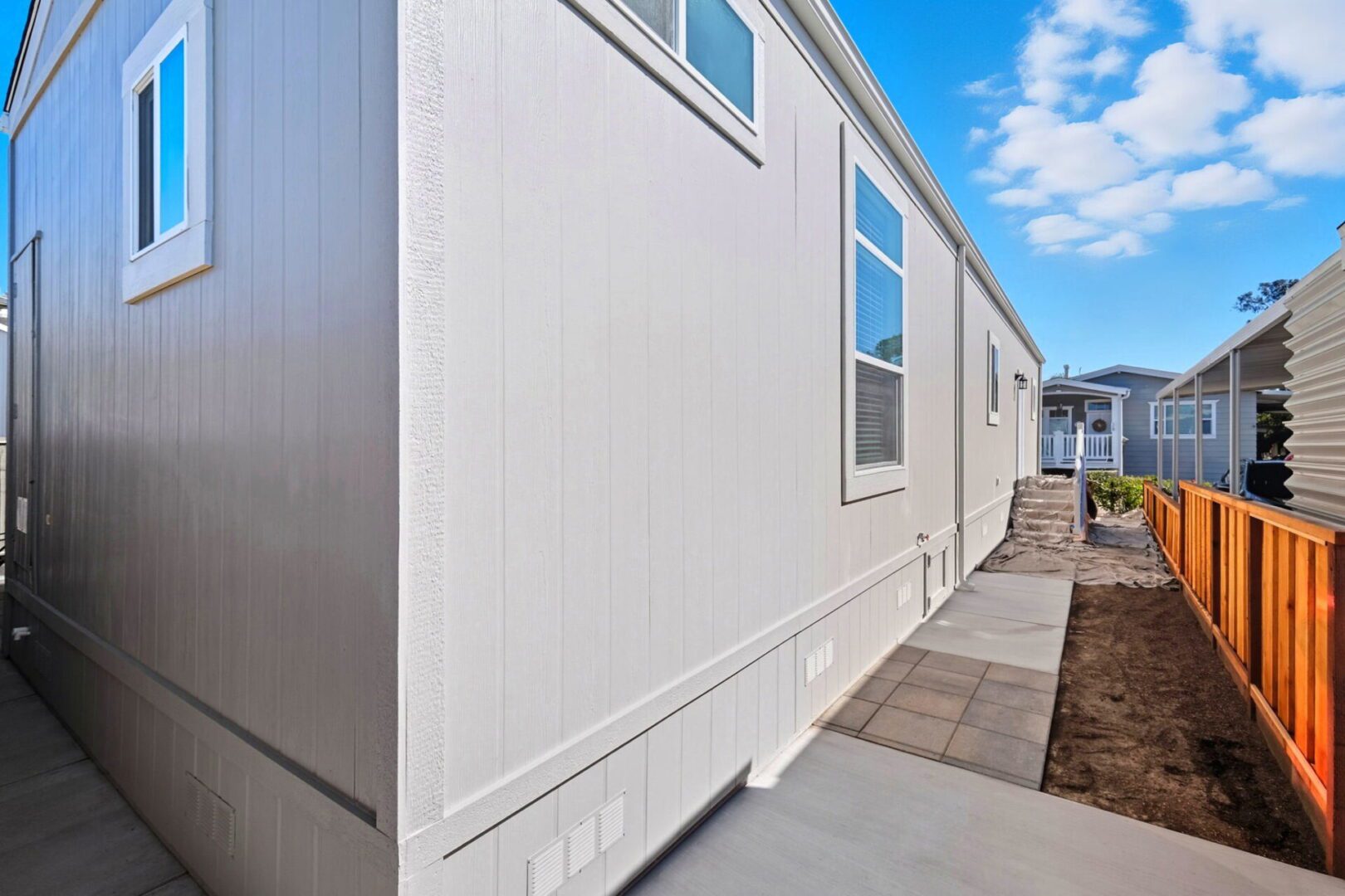 Beautiful 2 BR/2BA 864SF, Custom designed Quality Home is modern, light & bright with a spacious custom design and beautiful high-end features. This not so modest sized home is surprisingly spacious and has everything you need for comfort and easy living! 9′ High ceilings, 36′ doors large windows and 2 really nice sized bedrooms, a great kitchen, separate laundry room and Dining Living area that has plenty of room for Living and entertaining. Wonderful exterior has been extensively upgraded with brand new driveway, fencing, concrete walkways, utility upgrades, large paver patio and a custom shed. So much outdoor space to enjoy entertaining, relaxing and gardening! Beautiful white raised panel hardwood cabinets, Quartz counters in the kitchen, Stainless Steel appliances and two full bathrooms (one with tub and 1 with Shower) are all part of this gorgeous home. The primary bedroom is spacious with a lovely bathroom and walk-in closet. The living area and bedrooms have beautiful laminate floors. Separate laundry room with washer/dryer hookups and hardwood cabinets. Tall windows add a lot of natural light and crown molding throughout adds a lovely finishing touch. Rodeo Estates is one of the most wonderful 55+ communities in Santa Cruz where people are friendly, neighborly and love where they live, creating a great sense of community. Unbelievably low price! Brand New – with 7 years warranty! Call for a Private Appointment. Come Home for the Holidays! Serial number 2497A.